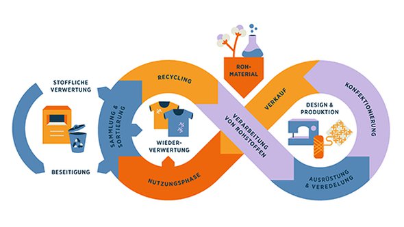 Kreislaufwirtschaft oder auch Circular Economy ist aufgrund ihrer Komplexität vielschichtig und oft nicht leicht einzugrenzen. Kreislaufwirtschaft bedeutet mehr als Abfälle aufzubereiten und zu verwerten. Eine längere Lebensdauer, der Einsatz von nachhaltigeren Materialien sowie ein verändertes Prozess-Management sind wichtige Faktoren in der umfassenden Gesamtbetrachtung, wenn es um den Lebenszyklus eines Produkts geht. Über die Produktebene hinaus ist es wichtig zu verstehen, was nach der Nutzung eines Textils passiert und wie Sammel- und tatsächliche Recyclingströme in Deutschland und in der EU aber auch weltweit funktionieren.